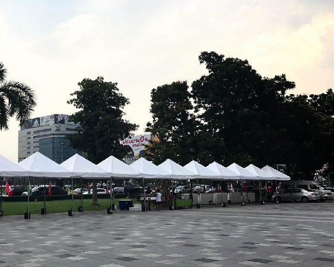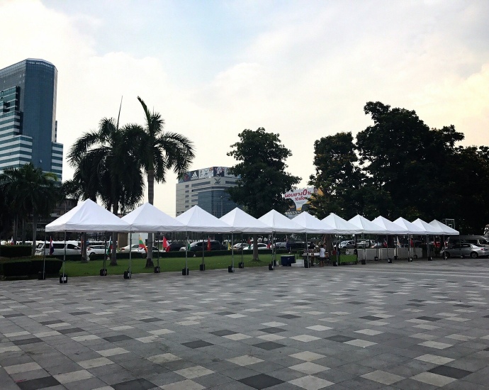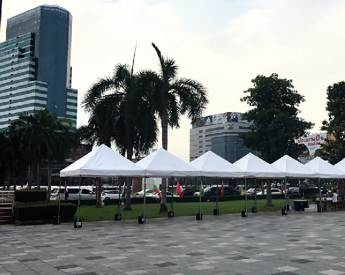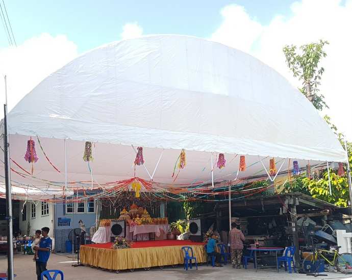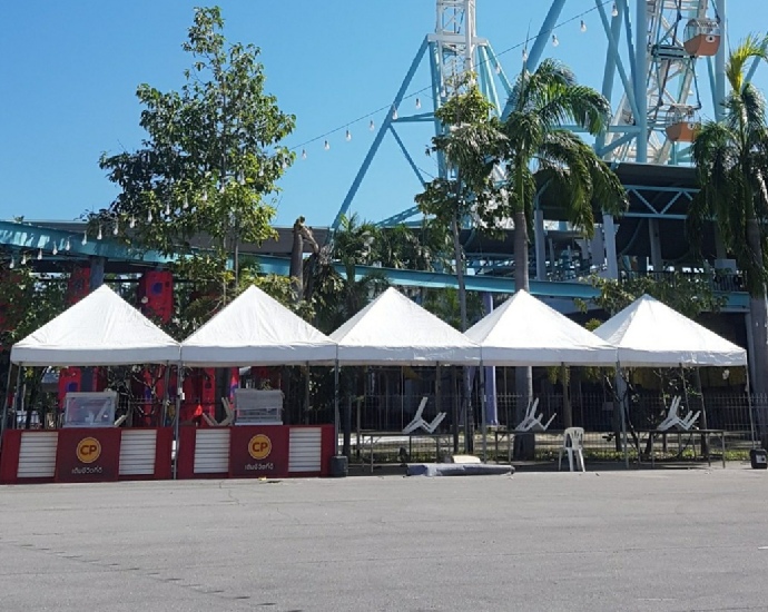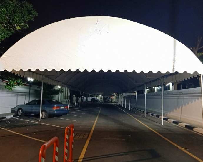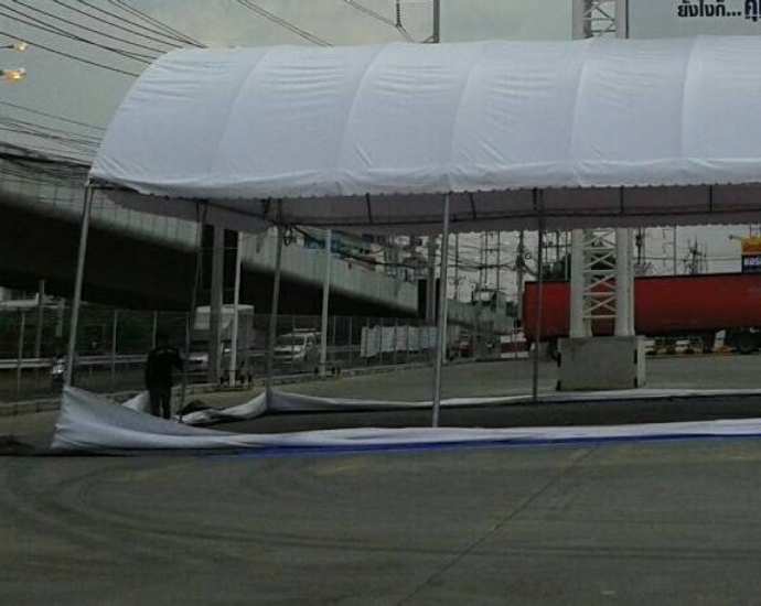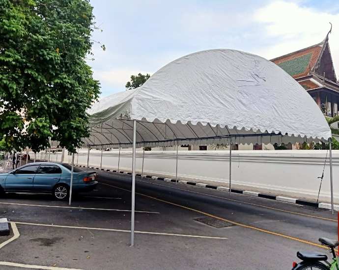 เต็นท์ทรงโค้ง มีขนาดความกว้าง ตั้งแต่ 4ม.–20 ม. ความยาวตามขนาดพื้นที่ของลูกค้ำ โดยโครงสร้างผลิตจากเหล็กแป๊ปประปำแบบหนา ผ้าใบสีขาวสะอาด