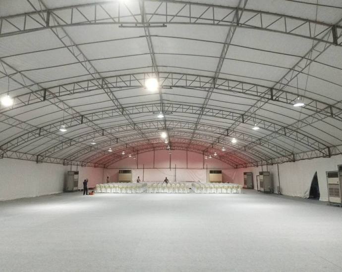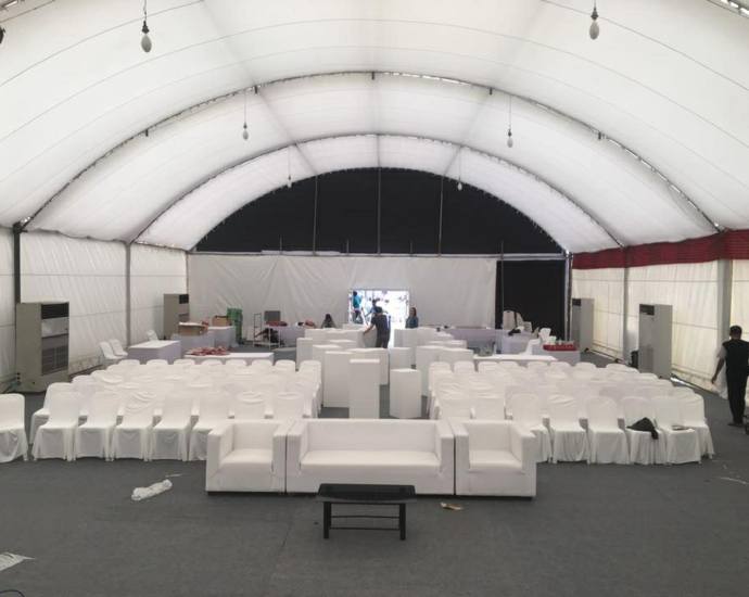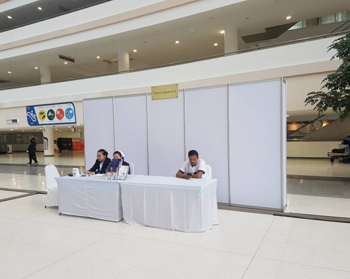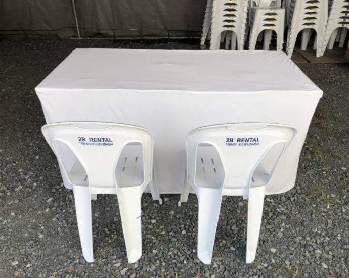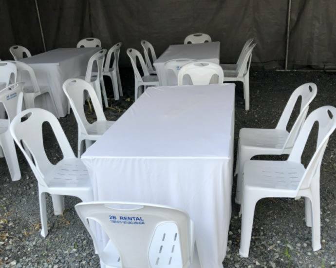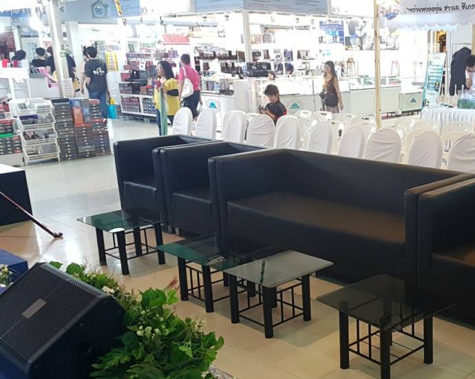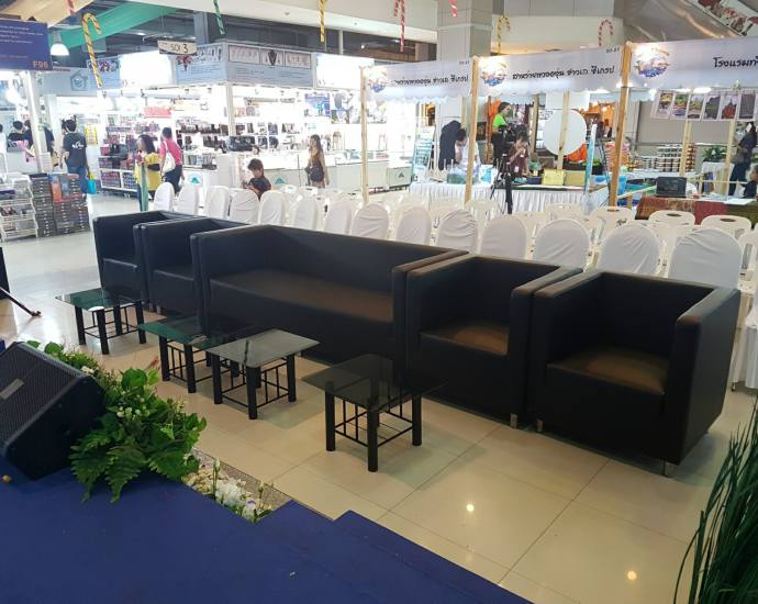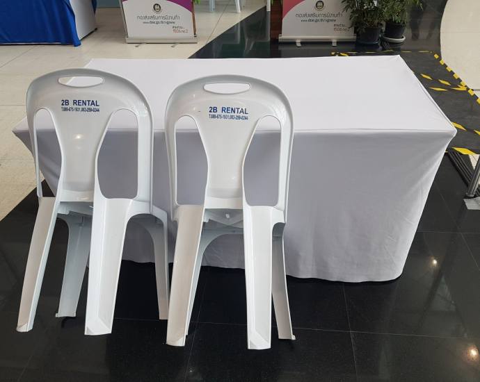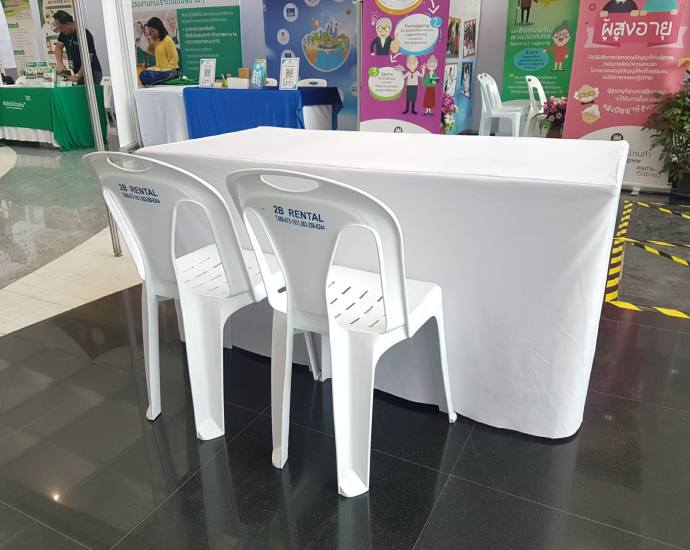 อุปกรณ์ในการจัดงาน เช่น โต๊ะเหลี่ยมพร้อมผ้าคลุม เก้าอี้พลาสติก เก้าอี้บุนวม พร้อมผ้าคลุม พัดลมธรรมดา พัดลมไอน้ำ แอร์ โซฟา โต๊ะสตูล พื้นพาเลท พื้นไมปรับระดับ พรมอัดเรียบ ฯลฯ ระบบไฟในเต็นท์ และในบูธ โต๊ะเหลี่ยมหน้าขาว ขนาด 0.75×1.50 ม. พร้อมผ้าคลุม